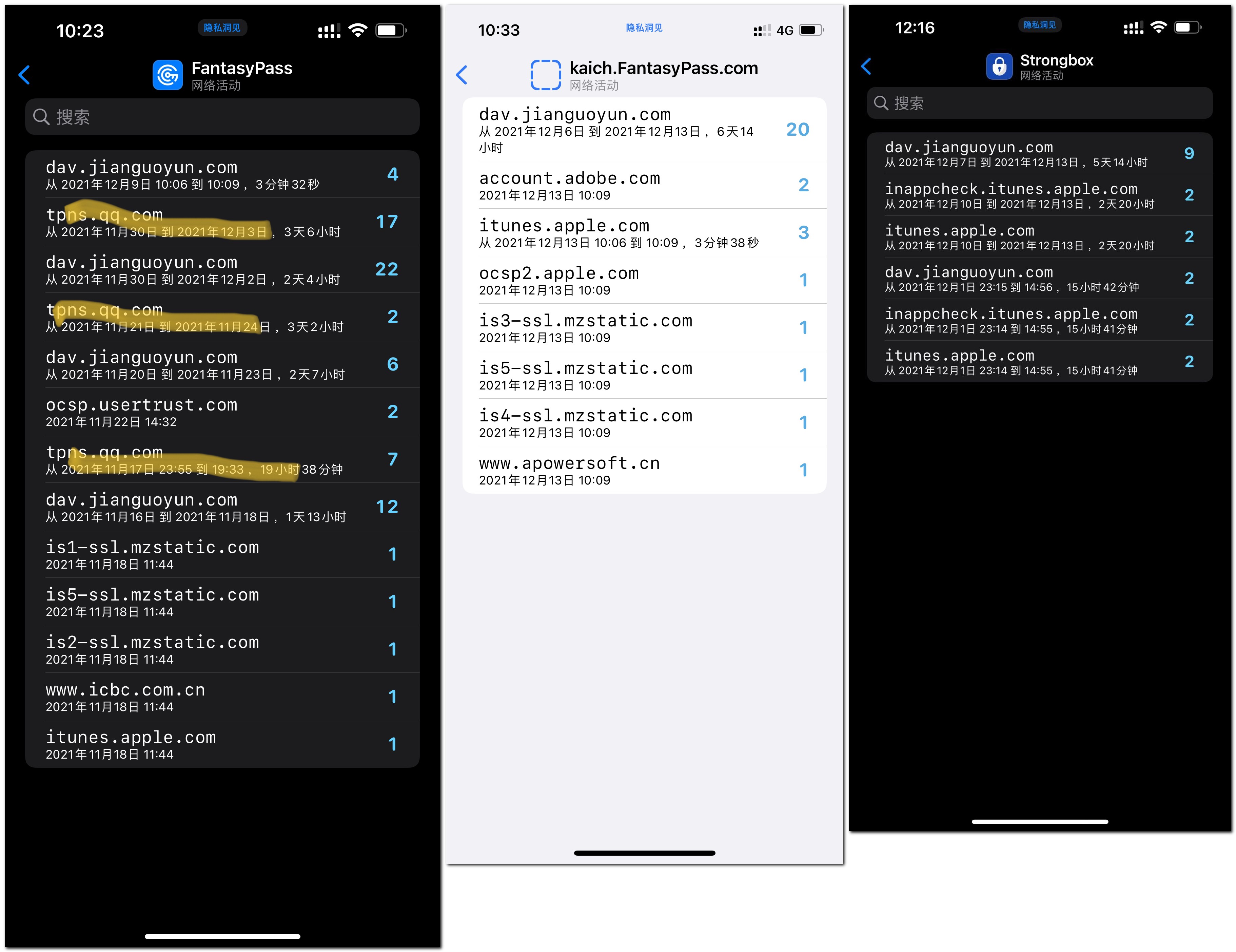 在使用一段时间后,我发现了奇密有几个网络访问记录: